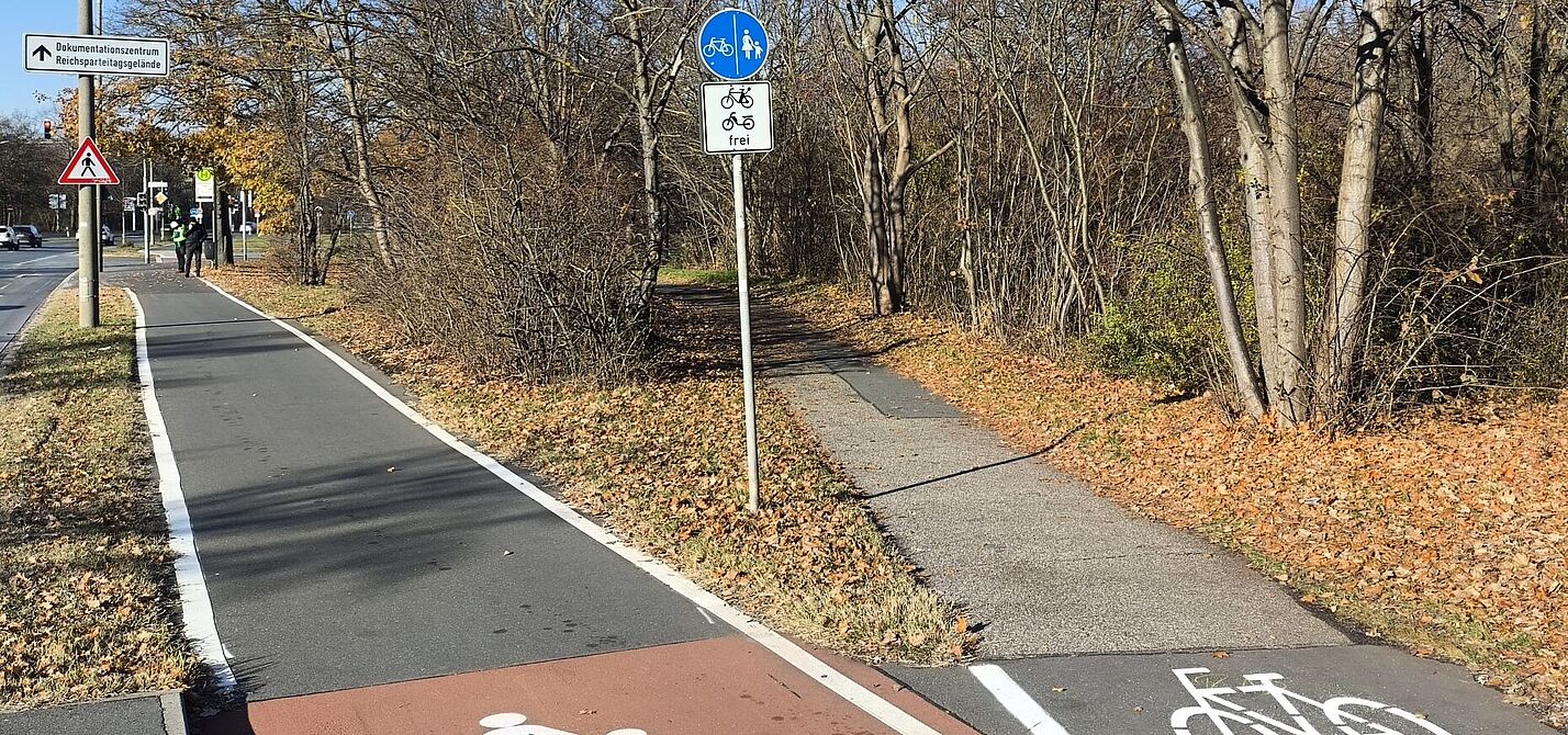 Der bisherige Gehweg ist unübersichtlich mit Knicken, abgeschottet von der Straßenbeleuchtung, ohne weiße Randmarkierungen und durch das Buschwerk im Bereich der Einmündungen an beiden Seiten schlecht einsehbar. Solche Situationen erfordern nach ERA 2010 noch größere Breiten als die Regelmaße. Das gilt hier besonders, weil dieser Radweg viele südliche Ortsteile Nürnbergs an das Zentrum anbindet, es geht also um eine Art „Überlandverkehr“, nicht um kleinräumigen innerstädtischen Verkehr. Hier muss schneller Radverkehr in beiden Richtungen gesichert werden. Ohne eine deutliche Verbreiterung, die Beseitigung von Buschwerk, eine leichte, schnelle und sichere Befahrbarkeit mit dem Rad sowie eine intuitiv eindeutig erkennbare Führung für Radfahrende und Fußgänger ist der jetzige Ansatz nicht einmal als Provisorium für 2026 akzeptabel, geschweige denn als perspektivische Lösung.