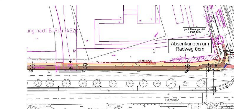 Am 28. Mai 2020 beschloss der Verkehrsausschuss des Nürnberger Stadtrates einstimmig einen schönen Plan: Wenn das ehemalige Auto-Kraus-Gelände im Dreieck zwischen Hain-Regensburger- und Scharrerstraße bebaut ist, sollen auf der Ostseite der Hainstraße, also vor den neuen Gebäuden ein 2,5 m breiter Zweirichtungsradweg und ein 2 m breiter Gehweg entstehen. Der Gehweg soll vor den Gebäuden mit den Eingängen liegen, der Radweg an der Seite zum Bordstein. Der Platz dafür ist schon im Bebauungsplan vorgesehen, der bereits am 28. März 2019 beschlossen worden war. Doch nach Fertigstellung der Gebäude im Sommer 2024 geschah erstmal nichts. Frühestens 2027 soll der längst beschlossene Plan umgesetzt werden.