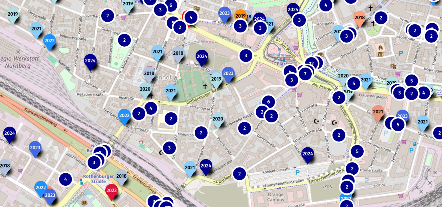 Wo also geschehen die Unfälle? Und was sind die Umstände? - Wir wollen mehr wissen als in den knappen Darstellungen der Polizei. - Dafür gibt es gute Grundlagen, nämlich die vom Statistischen Bundesamt bereitgestellten Daten. Der ADFC Nürnberg hat sie ausgewertet und jetzt aktualisierte Internet-Karten erstellt, auf denen man sich die Zahl, die Art, die Beteiligten und den Ort der Rad-Unfälle für die Jahre 2016 bis 2024 anschauen kann. – Ergänzt werden die Karten durch die beigefügte Datenanalyse der Radunfälle in Nürnberg.